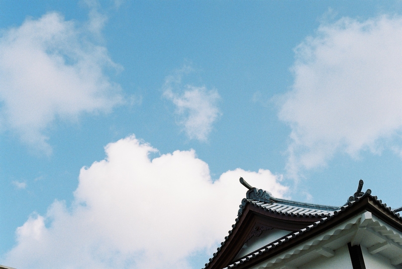 日本建築の屋根と青空のコラボが好きなので、それだけを撮りたくて一般的なフレーミングより上を向かせてみた。(左下に塀が入ってしまってるのはご愛嬌...)