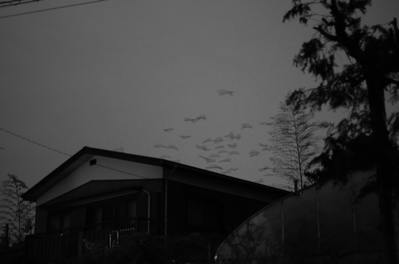 静かな夕暮れ、飛び立つ無数の烏達。