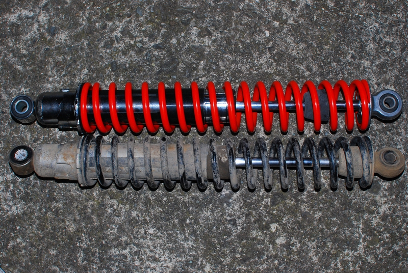 ・・・で、こちらの赤いスプリングのがXL185S用強化サス。汚いのが純正。スプリングの巻き数とか、そんなに見た目で大差ないのにビックリするほどカタイ!これ、レース前に替えてよかったのか?!ってくらい。まぁ、純正サスのオイル抜けてしまってたし(苦悪)