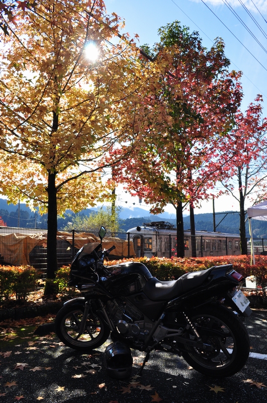 バイクと紅葉と電車