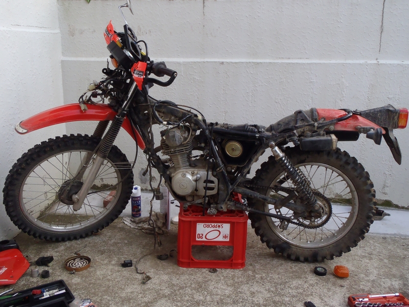 12V化を実行する事に。調べてゆくと、エイプ(キャブ仕様バッテリーレスタイプ)のメインハーネスを流用して12V化&バッテリーレス化が可能と知りました。じゃあ、軽量化にもなるからそうしよう!と、YahooAuctionでメインハーネスを落札して作業を開始しました。が、XL125Sの配線図は持ち合わせていたのですがエイプの配線図が無く四苦八苦。そんなこんなで1~2週間過ぎてしまいました。エイプの配線図を手に入れてからXLのそれと見比べて配線図を下書きして。そしたら案外サクサクと作業は進みました。