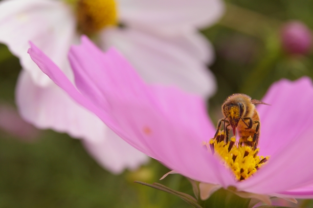 現在、苦手だったシグマの28-80mmをあえて使って克服修行中。写真は小さなコスモス畑(花壇?)で10分くらいミツバチと戦った修行。滝行ならぬ〝マクロ行〟でございます。月並みな構図でツマラナイですね・・・はぃ・・・
