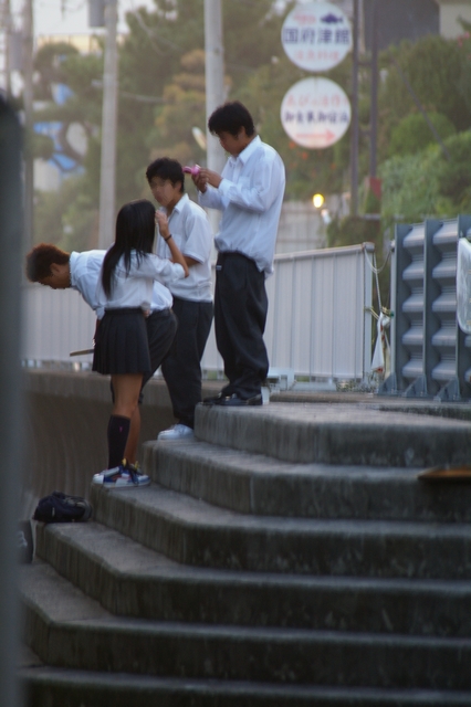 17日、帰宅後に時間がまだ早かったので国府津海岸までひとっ走り。海岸についてカメラ準備。すると、遠くの階段で高校生らしき集団が。