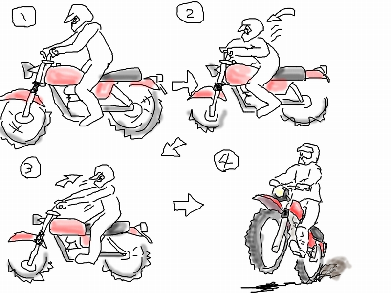 上の動作4っつは、それぞれステップアップしながら行うと安全で良いと思います。まずは、スタンディングで安定して走れるようになる。次にフロントに荷重をかける練習をして、なれたら重心を後に戻すアクションを交える。これが出来た上でアクセルを開ければ、どんな非力バイクでも少しはフロントが浮きます。あとはアクセルの開閉具合とクラッチをダイレクトに繋げられるかでしょうね。