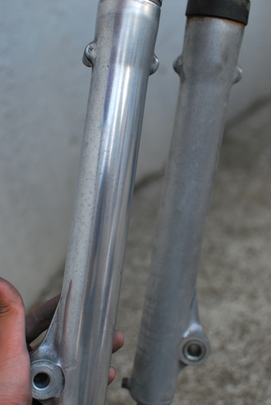 エンジン下にツールケースを入れて、フロントを浮かせた状態でタイヤを外して・・・フォークを抜いて。インナーチューブは錆び、ボトムケースは軽く腐食。うぉー!こういうレストアライクなことやいたかったんだぜーっ!