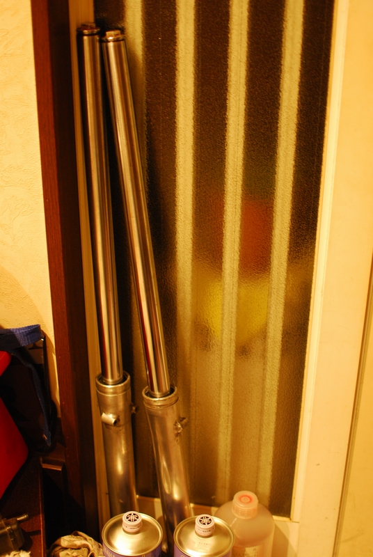 フォークオイルを入れて、エア抜きのため数回伸縮させて、放置。しばらくして伸縮させてみたら、まだエアが残っているかのような音がする・・・ふぅむ・・・
