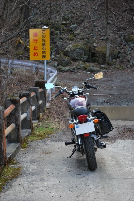 ずっと走り続けて、舗装面が終わった場所が写真のところ。橋を渡ると、いきなりダート。ここで引き返そうとも思ったのですが「道の始まる(終わる?)場所」を見たいと思い、何を考えたのかエストレヤでオフロードの林道へ突入(笑)