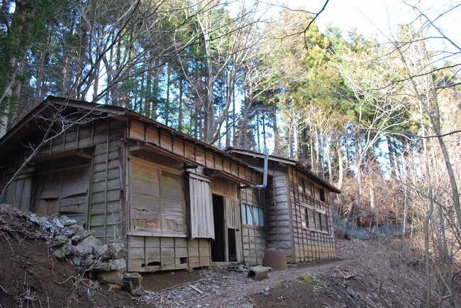 しばらく山道を歩いていくと、木造の山小屋らしき建物が。今は誰も使用していないらしく、かなり異様な雰囲気を放っています。出入り口の木製の戸は破壊され、中の様子が伺えるようになっていました。真ん中にだるまストーブがあり、その周りにイスがありました。動物的な直感で中には入りませんでした。