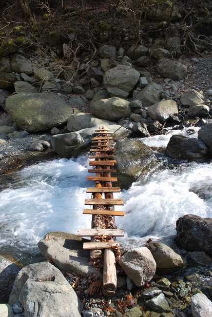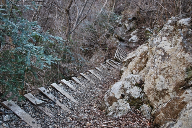 最初に滝があると教えてくれた男性の口調的に、ハイキングコースみたいな山道を想像していましたが違いました。ハイキングと言うよりもトレッキング?木製の足場が崖沿いに渡されています。川まで十数メートルあり、それなりに迫力があります。恐いです。ちなみに、一部足場が痛んでいて不必要にしなりますのでご注意。