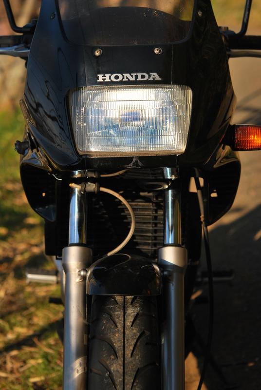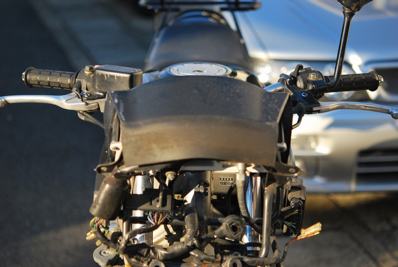 フロントフォークを中心に見てみると分かるんだけど、ヘッドライトが写真右側に寄ってしまってる。まぁ、ハンドルを切っても干渉はしないんだけどやっぱり直すよ。