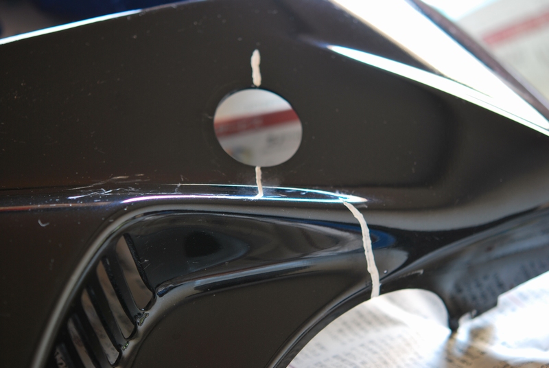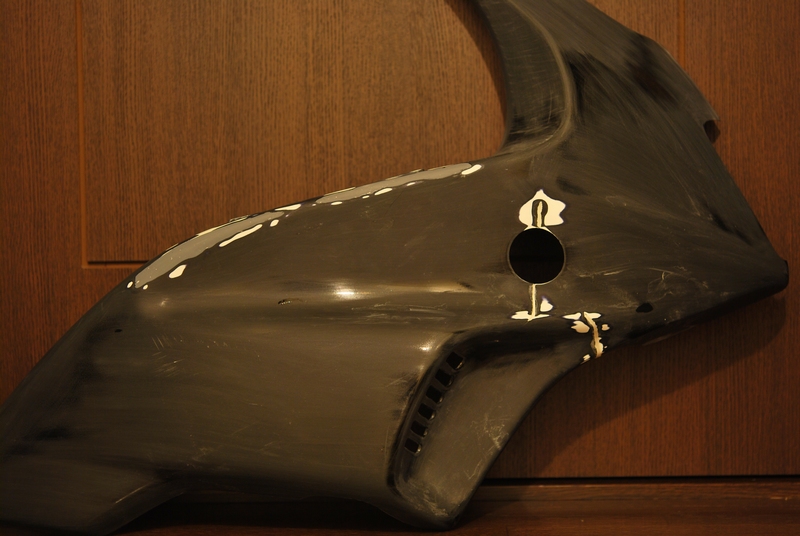 亀裂部分はプラリペアで修復し、えぐれていた部分はパテを盛って成形。そして、塗装の準備のためアシツケを#400の耐水ペーパーで。ってやってたら今日は終わってた(笑)