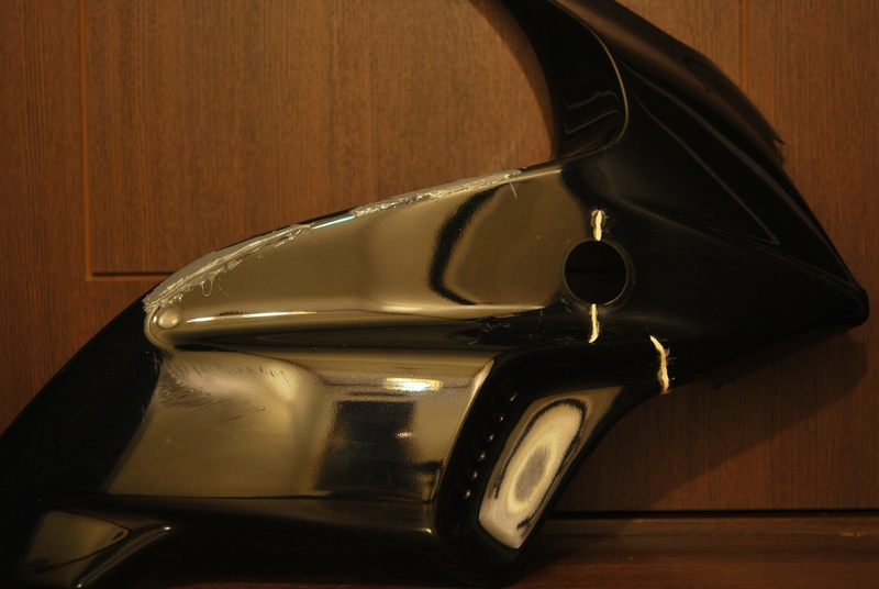 コケた側のライトカウル(右側)が思ったよりも重症で。ウィンカー付近に3箇所亀裂。チケットボックス部分が折れていて、側面部分はがっつりとえぐれているし。