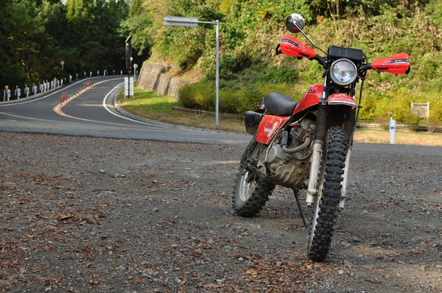 白岩林道を抜けてすぐ左に曲がり、倉掛林道へ入りました。始点から終点まで数百メートルの短い林道で、ダート部は200m程度でしょうか?ただ、朝日がちょうど差しこんできて綺麗だったので記念撮影をしました。