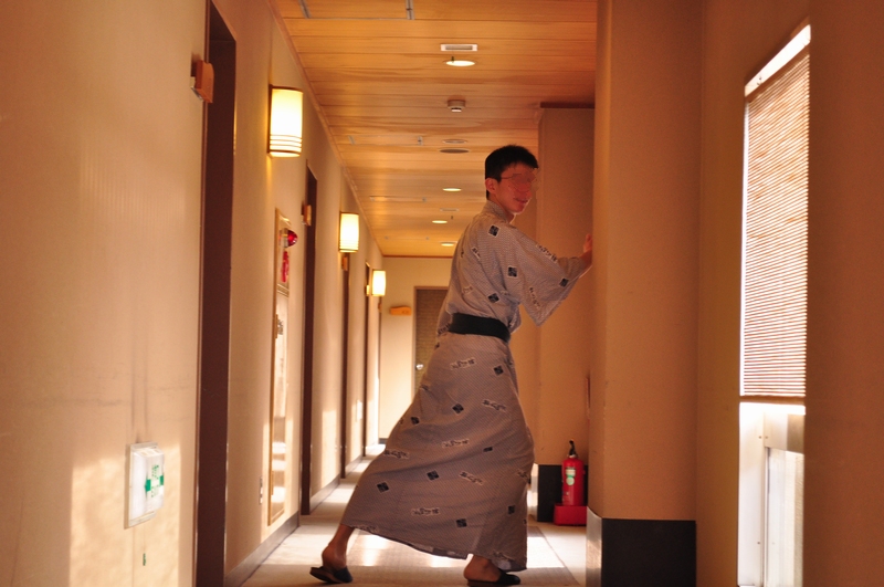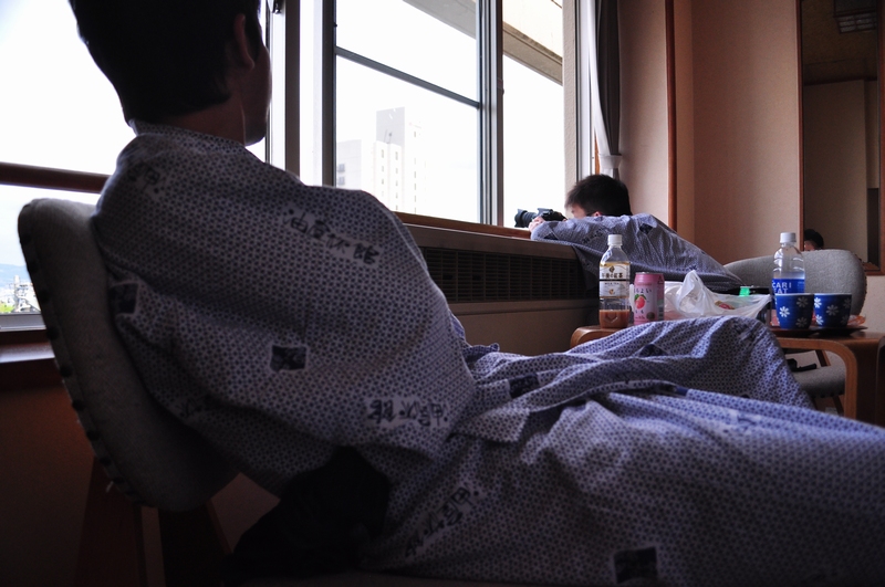 友人も起床し、窓の外を見て「晴れてる!(・∀・)」とテンションアップ。ぐだぐだしながら、窓の外を見ているこの空気を抑えたいと思って撮ってみました。このぐぅたら加減が(優柔不断な)男二人旅なのです!(笑)