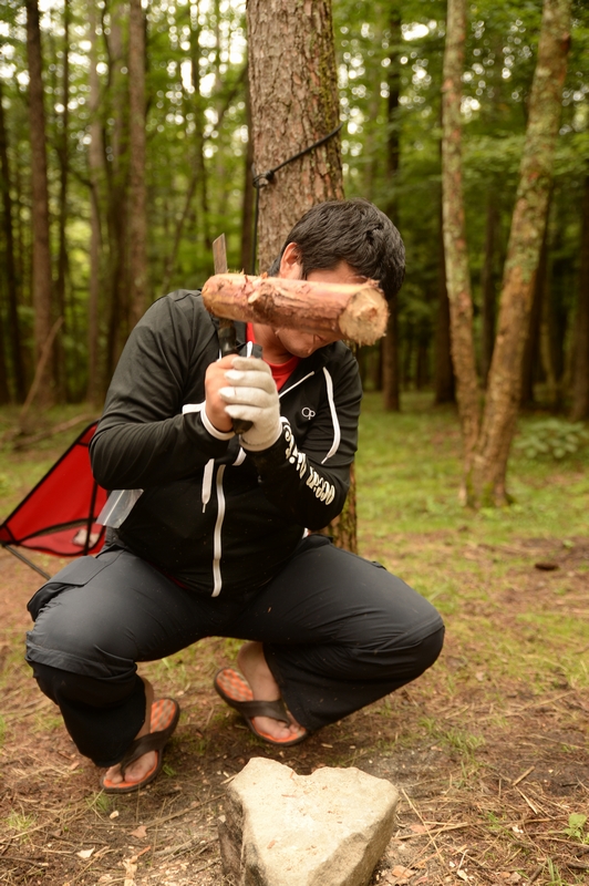 前回のキャンプで勉強したので、友人T氏の実家から鉈を借りてきていただいて薪割り!