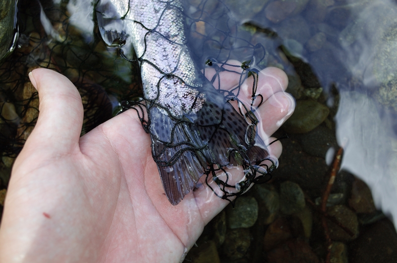 放流魚かどうかは、尾ヒレを見るのがポイントだそうです。放流直後の魚は、生簀の内壁に尾ヒレが擦れてしまうため丸まっているそうです。釣ったニジマスは綺麗な尾ヒレをしていて、近くにいらっしゃった漁協組合の人いわく、昨年放流したものではないか?とのことでした。