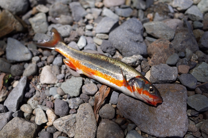 実は会社を休んで出かけた釣りだったので、ニジマス一匹では帰る訳にもいかずに粘り強くルアーを掛けてキャストし続けた結果、綺麗な魚がつれました。オレンジ色のラインが気になりますが、たぶんウグイですかね?