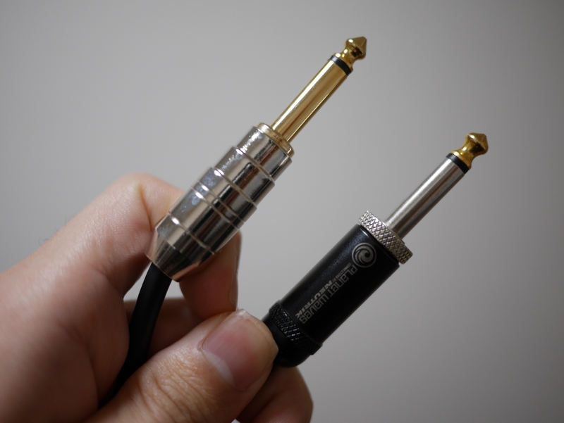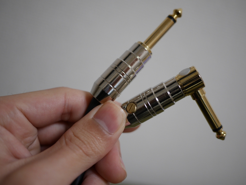もともと持っていたケーブルはSSで、両端ストレート端子でした。ただ、ギター/ベース側はL字プラグが欲しいと思っていたので、今回はSLを購入。このプラグの無駄な(?)マイナスネジが古臭くて見た目は結構好きだなー。笑