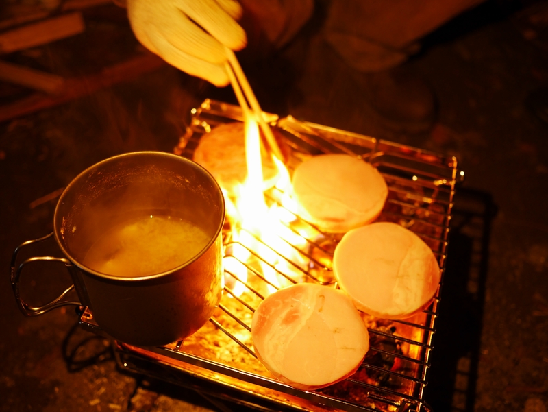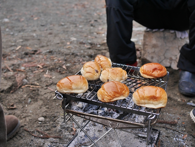 こちらは翌朝、火が収まった頃にパンを焼いているところです。結構良い感じに焼けて、美味しく頂けましたよ(・∀・)