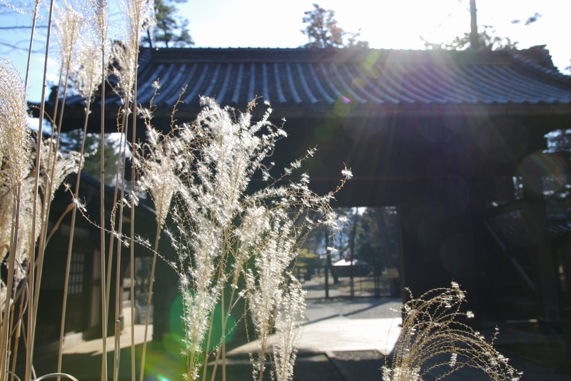 細かな彫刻が至る所にされており、感心してしまいました。ちょうど門の前には逆光に輝くススキがあったので一枚パシャリと。