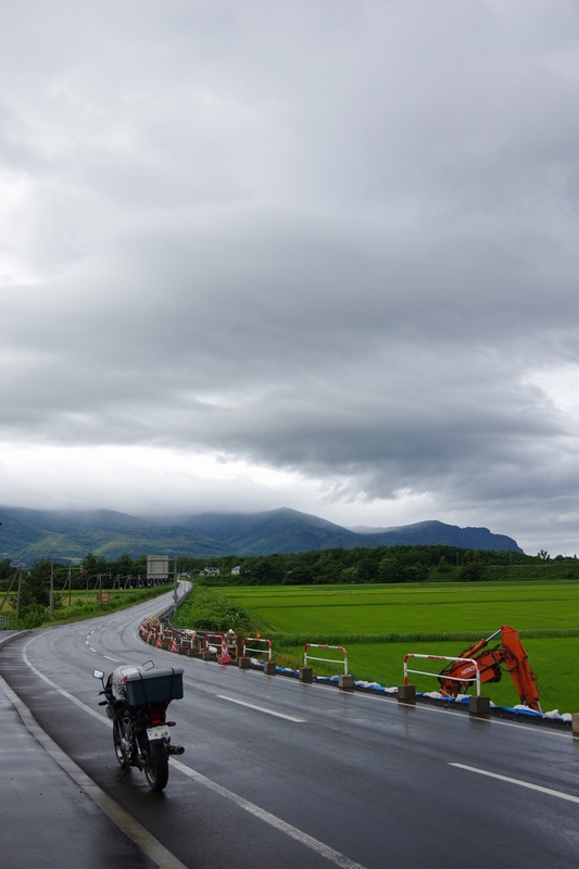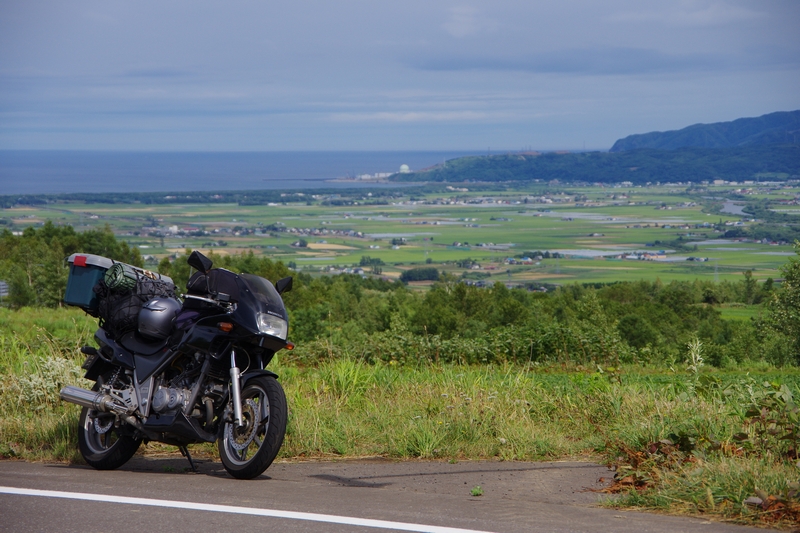 とりあえず、岩内町まで南下したものの南の方向だけ嫌な空だったので急遽方向転換。東進することに。道道を走っていると、街を見渡せる場所に。写真を撮っていると、カブ乗りの旅人が畑道から出てくる。「おっ!」と思っていたらピースサイン。僕も手を振りながらピースサイン。