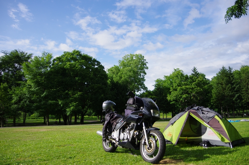 僕がテント設営をしていると、どこからともなく見覚えのあるバイクが。そう、TDM。ばばさんが最近乗り換えた希少車。しかも同色ときたら「マジか!明日苫小牧到着って言ってたのに、今日到着でのドッキリか!!」と思いながら、ちょっとニヤニヤしながら近づいていったら全然知らないオジさんでビビった。