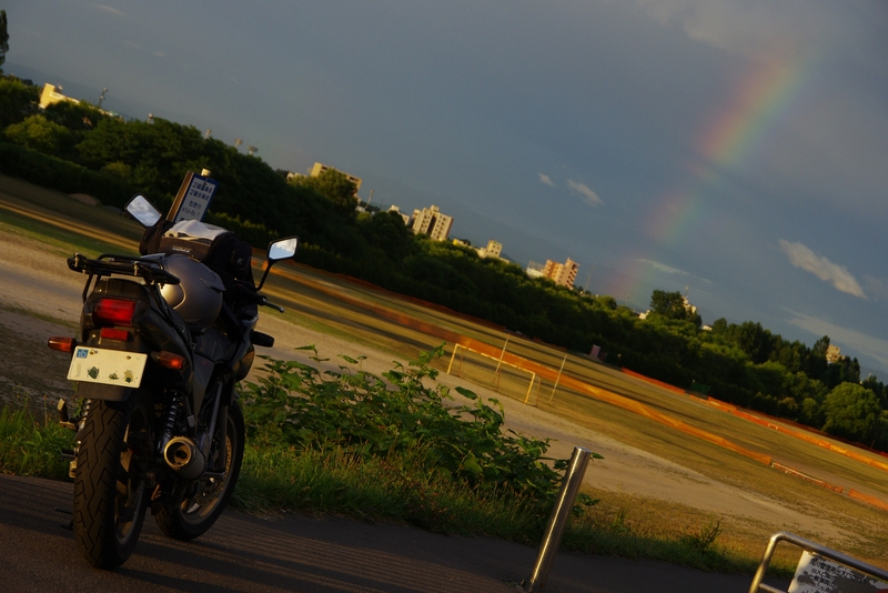 西神楽のキャンプ場にテントを設営し、荷物を置いてから旭川市街地へ。ラーメンを食べ終わって温泉に行く途中に虹が色濃く見えました(・∀・)