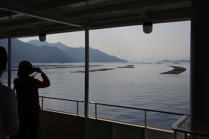 広島駅でJR山陰本線に乗り換えて30分ほどで、厳島神社で有名な宮島へ渡るフェリーが出る宮島口駅へ到着する。宮島への渡船は2種類ある。JR西日本宮島フェリーと宮島松大汽船である。とりあえず、JR西日本宮島フェリーへ乗り込む。瀬戸内の洋上にはカキの養殖イカダが数多く漂っている。それが、瀬戸内までやってきたのかと感じさせる。