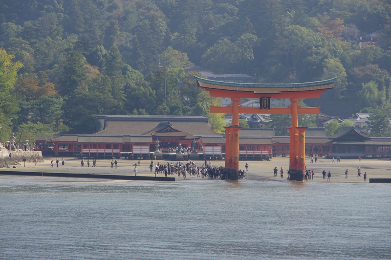 フェリーに揺られること数分で、厳島神社の大鳥居前まで船は進む。ちょうど干潮のタイミングだったらしく、鳥居が根元まで露になっていた。