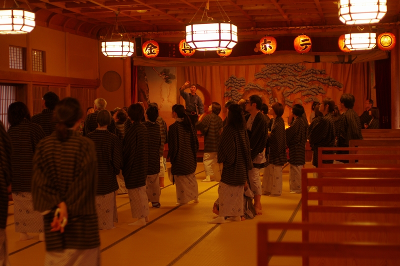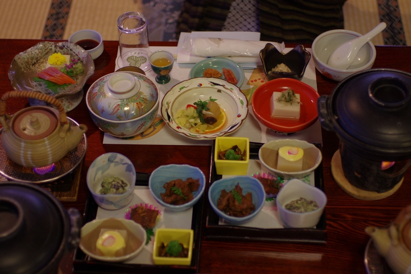 18時に食事と予約していたので時間通りに食堂に行くと、館内ツアーのご一行が九代目(仮)の説明で大広間の見学中。おちおちご飯食べてられないので、片耳で説明を聞いておきましたw