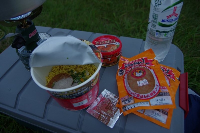 ってことで夕食。ハンバーグは湯煎ですぐに作れるし安いからと買ったのだけれど、キャンプ場についてよく見たら賞味期限がとうに過ぎていて笑ったw