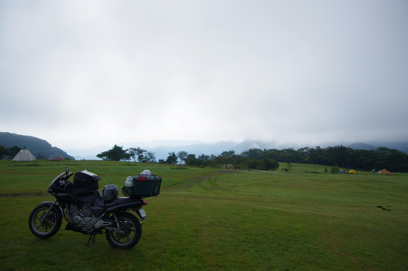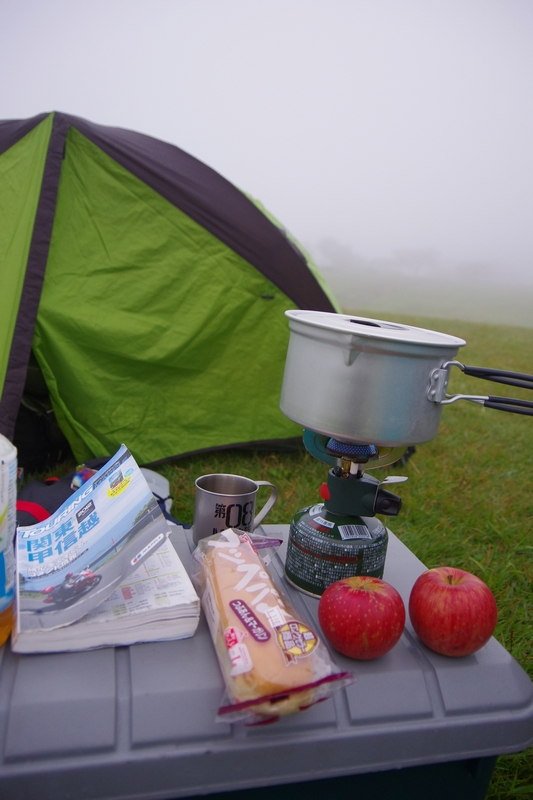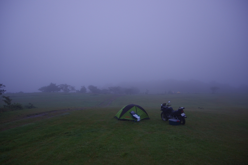 前日は快晴だったキャンプ場も、朝はご覧の通り濃霧。まぁ、濃霧というよりは雲の中に入っているだけなんだろうけれど。