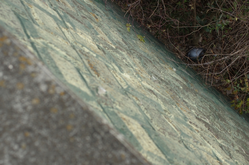 この丁度真ん中らへんに落としてしまったため。道路と緑色部分の間にある灰色部分が石垣です。そう、真ん中らへんは一番高低差が激しい場所でした。