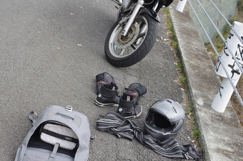 ヘルメットが崖の下で息絶えているのを目の当たりにし、さまざまな思いが過りました。正直、一瞬ヘルメット被らずに帰ろうかとも思ったけれど、警察に捕まるし、それ以前にメットなしでバイクなんて怖すぎる。結局、分かりきっているけれど取りに行くことに。
