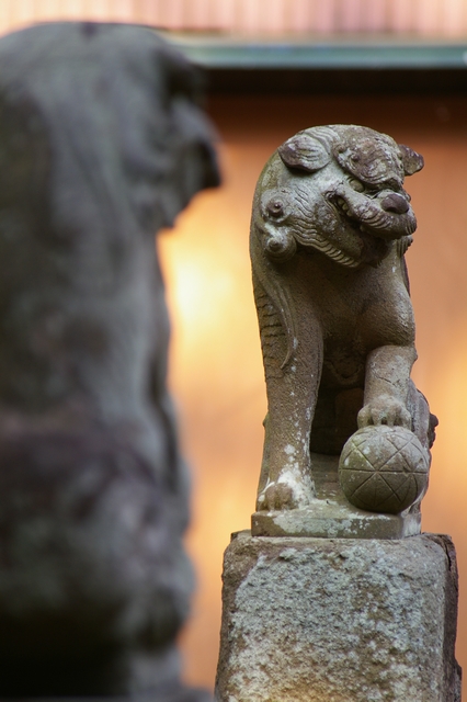 猫のいた神社の境内。この神社は珍しいことに、狛犬様が2対いらっしゃるんです。この写真は本殿に近い側の古い狛犬。鳥居側にも新しそうな狛犬様がいらっしゃいます。