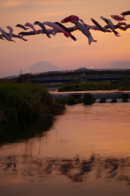 帰りに、前にも立ち寄った事があるこいのぼりを見に行きました。赤く染まる夕空にたなびくこいのぼりたちが哀愁をかもし出していました。