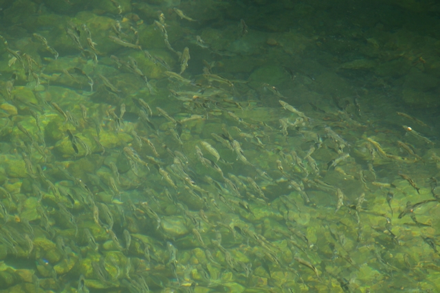 帰りに中津川に立ち寄ると、釣り人さんが釣りしていました。橋の上から覗いたら写真の通り、大量の魚が。これなら釣りまくりじゃね?とか思った(笑)