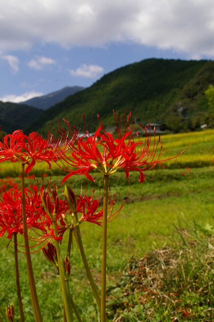 彼岸花は田んぼのあぜ道や、その周辺にいっぱい。まだ満開ではありませんでしたが、それでも鮮やかな赤が印象的でした。