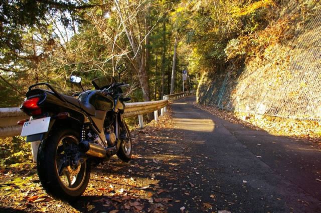 こちらが険道の中盤。ちょうど待避所に退避させて撮影しました。こんなに狭い道なのに、思っていたよりも交通量があってびっくり。私が仮に、車を運転してココに来たなら間違いなく引き返すくらいの狭さ。普通乗用車でも辛いのではないでしょうか?