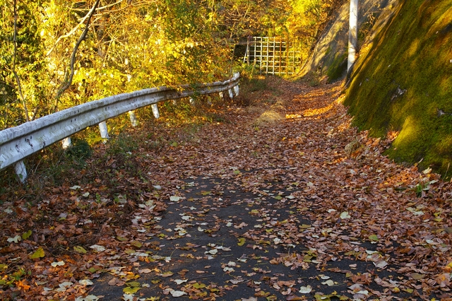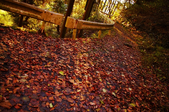 物凄いバリケードが行く手をふさいでいます。目の前に行き止まりがあるから、誰も足を踏み入れないのか、足元にかなりの枯葉が堆積していました。