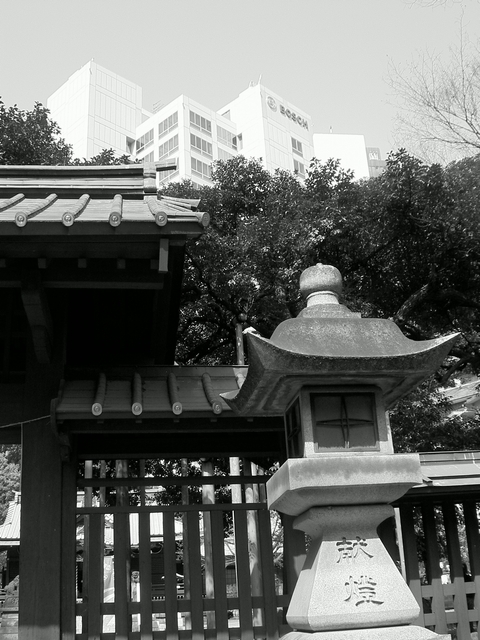 少し下がって、門の前から空を見たところ。手前は樹木が生い茂っていますが、さらに奥にはビルが立ち並びます。うぅ~ん、凄いコントラストだよなぁ。でも、東京ってコンクリートとアスファルトばっかりの印象があるのでこういう空間があると落ち着きますよね。
