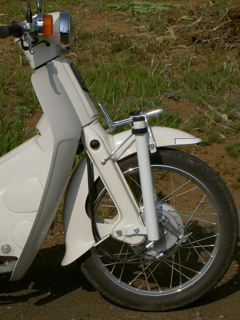 カブ90デラックスをベースにしているらしいです。大きな変更点はカラーリングとフロントキャリアに取り付けられたロッドケースですかね?ちなみに、反対側にももう一本ついています。