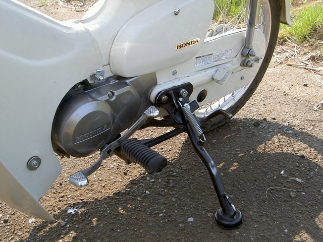 あと、コチラの強化サイドスタンド。プレスカブなどに使われているものと一緒ですね。他に違いと言えば、ナンバープレートベースがついていた点と、リアボックスにPOLICEと書かれていたくらいですかね?まだまだ見たかったのですが、警官の方の終了の合図があったのでこれ以上は無理でした(笑)