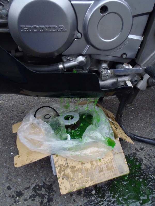 今日の作業の中で唯一、私が経験したことが無かったのがクーラント液の交換。友人がニヤニヤしながら